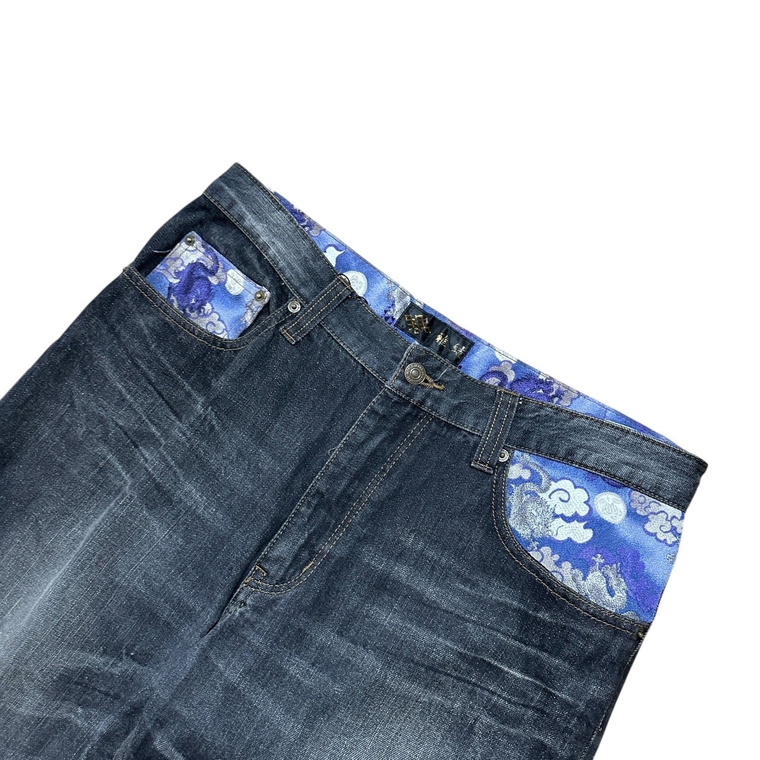 Vintage Japanese Denim Dragon Jeans – Blau, Schwarz (Größe 33)