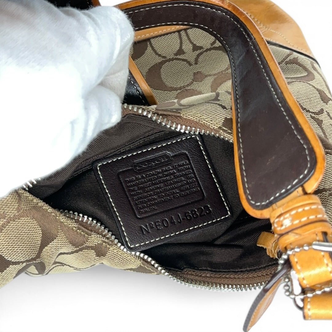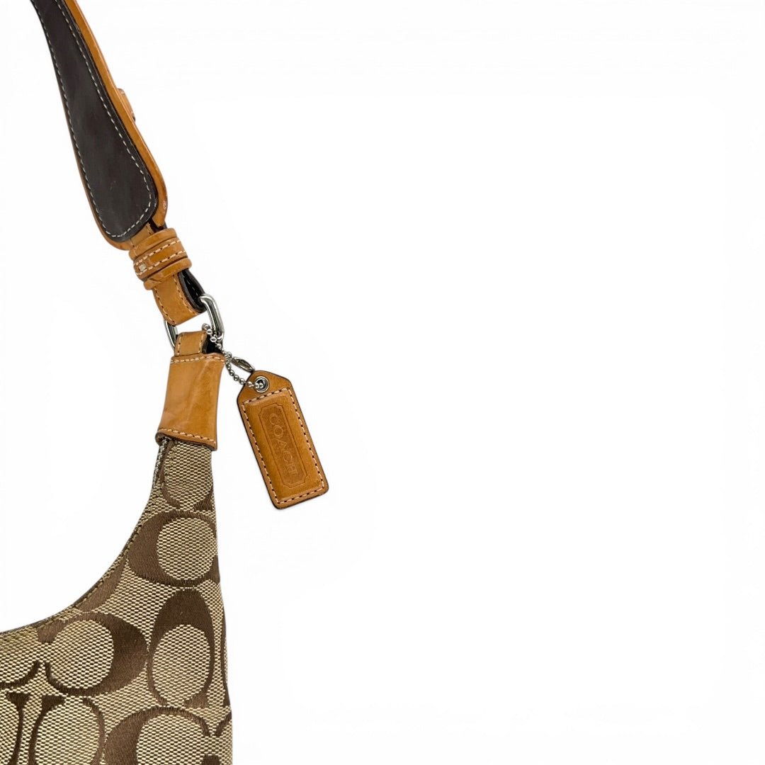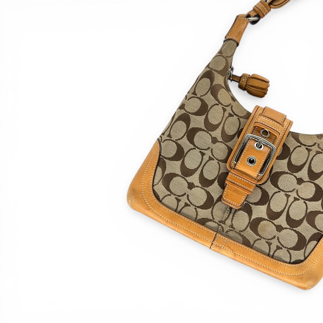 Authentische Coach Signature Shoulder Bag im klassischen Braun/Beige Monogram mit auffälligem Buckle-Detail auf der Front. Die Kombination aus Canvas und warmem Leder-Trim bringt genau diesen typischen Y2K Coach Look, der aktuell wieder extrem gefragt ist.