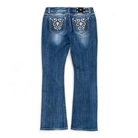 Diese Vintage-Jeans von Miss Me vereint klassischen Western-Glamour mit modernen Details. Entdecke die perfekte Kombination aus Used-Wash und Bootcut-Passform, die deinem Look das gewisse Etwas verleiht.