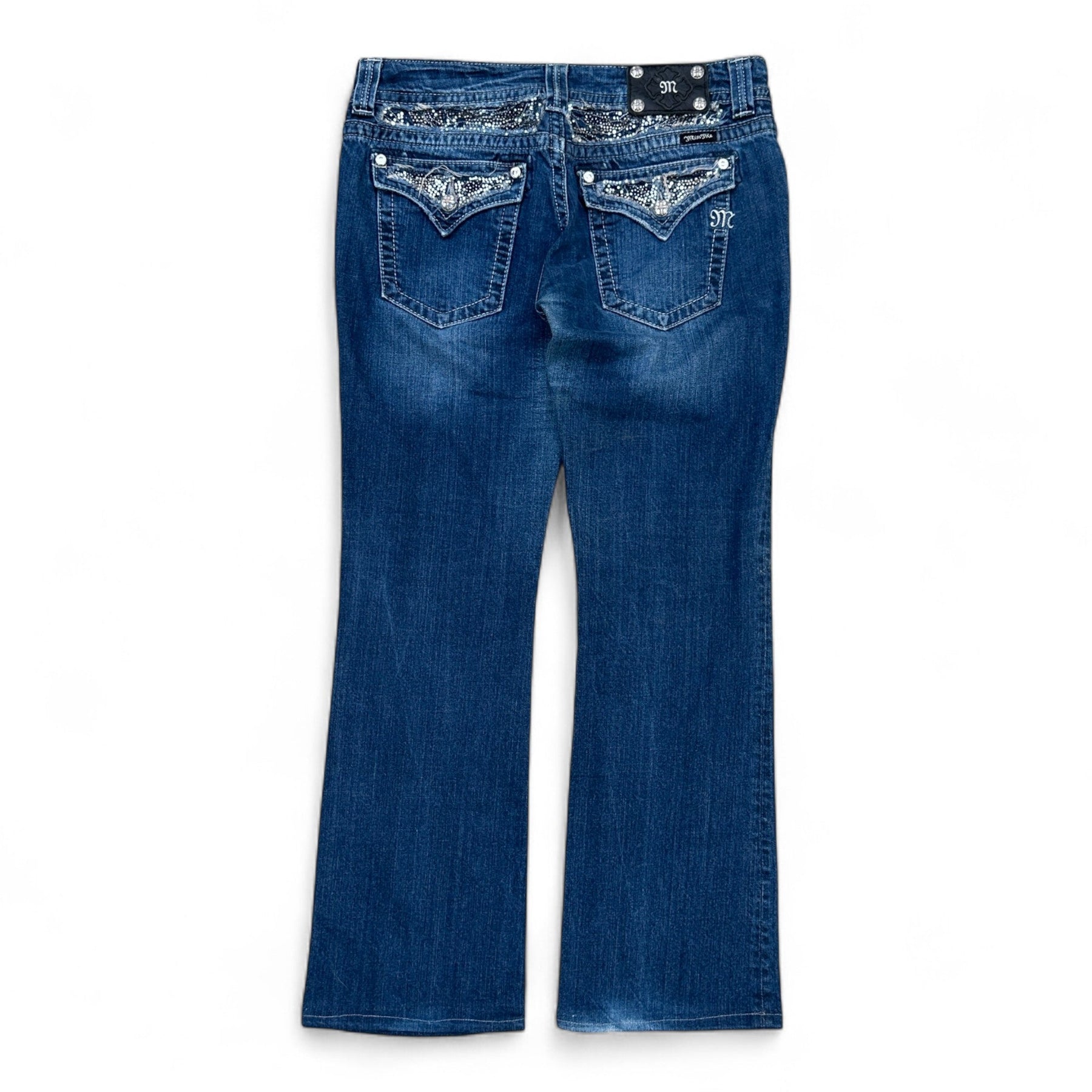 Diese Vintage-Jeans von Miss Me vereint klassischen Western-Glamour mit modernen Details. Entdecke die perfekte Kombination aus Used-Wash und Bootcut-Passform, die deinem Look das gewisse Etwas verleiht.